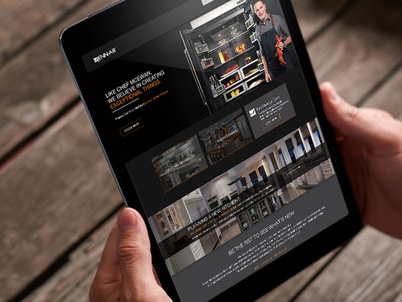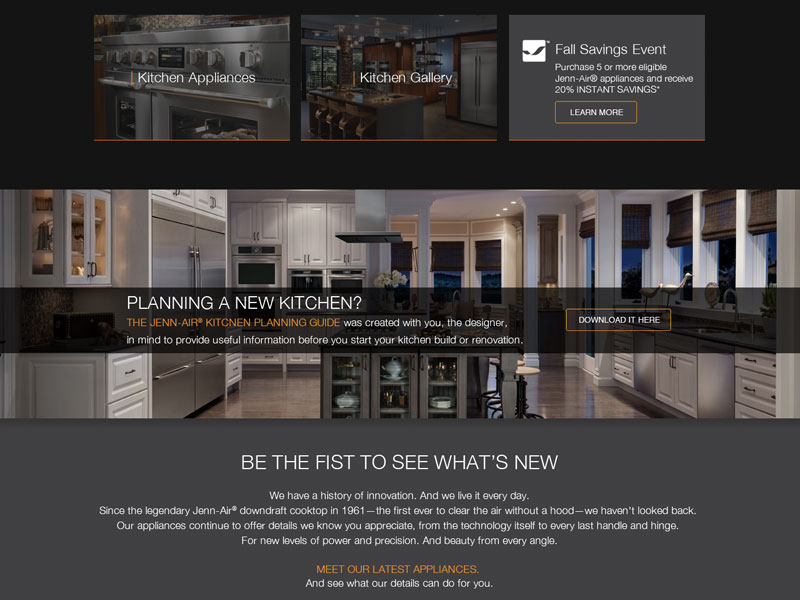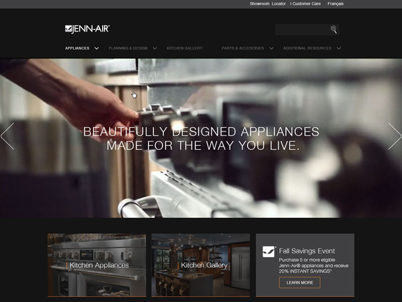 Working in the capacity of Art Director with then Softfocus – now The Creative Guild, a hamilton Ontario based design agency, I was instrumental in bringing the brand to a WordPress platform. We used a Woo-commerce add-on in catalogue mode to manage and present the JennAir® products from the Whirlpool Canada database. This was the first website of its kind built on a WordPress platform for the client. Immense care was taken to gain stakeholder buy-in through the development of a number of interactive high fidelity prototypes using Axure. This helped to gain the client confidence needed to explore the high style visual language used by the JennAir® Brand.